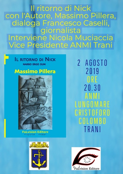Oggi, venerdì 2 agosto, alle 20:30 presso il lido Anmi, sul lungomare Cristoforo Colombo, avrà luogo la presentazione del libro di Massimo Pillera dal titolo Il ritorno di Nick, eEdito da Falvision. Dialogherà con l'autore Francesco Caselli, interviene il vicepresidente di Anmi Trani, Nicola Muciaccia. Ingresso libero.
