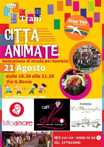 Ritorna Xiao Yan con la sua animazione di strada. Il prossimo appuntamento con le "Città animate" è per mercoledì 21 agosto dalle ore 18.30 alle ore 21.30 in via Giovanni Bovio. La cooperativa tranese, con il suo ludobus, farà divertire bambini e ragazzi con gonfiabili, giochi di società e di gruppo per un pomeriggio d'estate pieno di aggregazione e divertimento.