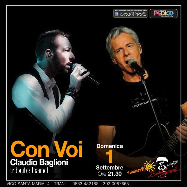 Domenica 1mo settembre, dalle 21, il Santo Graal ospita Con Voi - Claudio Baglioni tribute band, con Giuseppe Panarelli Voice-Leader del gruppo, noto a livello nazionale per la sua similitudine timbrica a Baglioni.