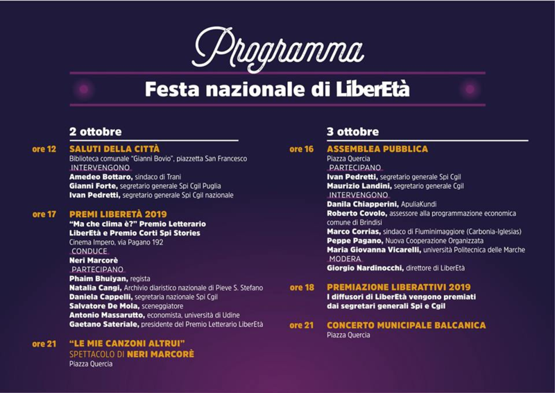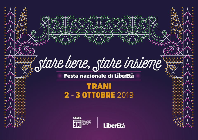 Dal 2 al 3 ottobre il Sindacato Pensionati Cgil è a Trani per la Festa nazionale di LiberEtà, dal titolo Stare bene, stare insieme.