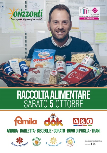 Un vero e proprio giro d'Italia che dona, fatto di iniziative durante tutta la settimana volte a sensibilizzare la cultura della donazione in ogni parte d'Italia. L'associazione Orizzonti, che nel 2016 ha ricevuto dall'Istituto Italiano della Donazione il bollino di "Io Dono Sicuro", rientrando nel primo database italiano composto solo da organizzazioni non profit verificate, a tutela della trasparenza per i donatori, aderirà al #DonoDay2019 con una raccolta alimentare straordinaria per i più bisognosi prevista Sabato 5 ottobre nei punti vendita Dok, A&O e Famila dei comuni di Andria, Barletta, Bisceglie (qui già effettuata lo scorso 28 ottobre), Corato, Ruvo di Puglia e Trani.