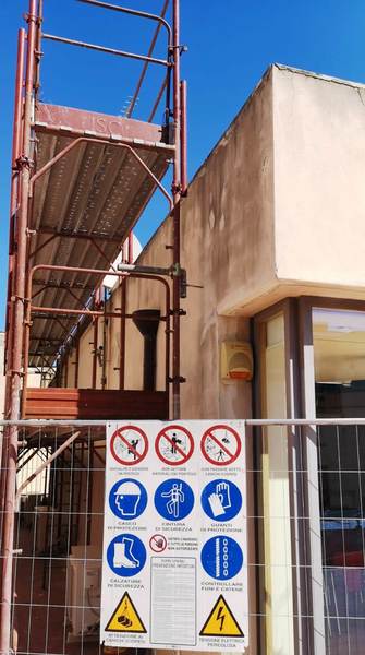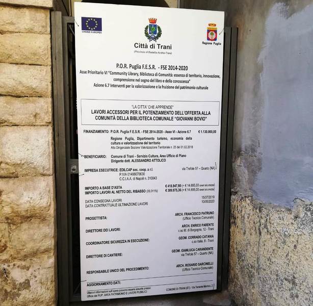 Alla biblioteca comunale di Trani sono comparsi il cartello dei lavori ed anche le prime impalcature: pertanto, almeno una parte della Giovanni Bovio è un cantiere.