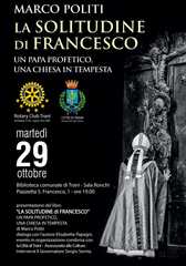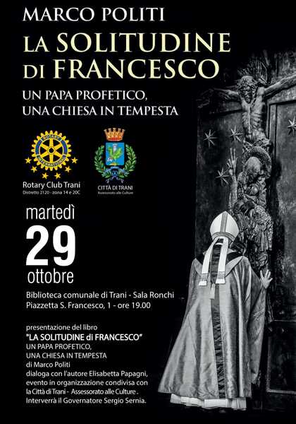 L’assessorato alle culture della Città di Trani, in collaborazione con il Rotary Club Trani, organizza martedì prossimo, 29 ottobre, alle 19, la presentazione dell’ultima opera del noto vaticanista Marco Politi, "La solitudine di Francesco" (ed. Laterza, 2019), che ha come significativo sottotitolo: “Un papa profetico, una chiesa in tempesta”.