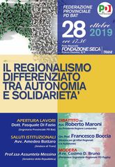 La Federazione provinciale del Pd organizza per lunedì 28 ottobre un incontro su "Il regionalismo differenziato tra autonomia e solidarietà". L'appuntamento è al Polo Museale in piazza Duomo alle ore 17.30.