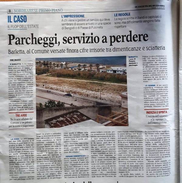 Lo ha fatto con una pagina dedicata al cosiddetto «Servizio a perdere dei parcheggi». Il gestore dello stesso, la partecipata Barsa, lo avrebbe affidato ad altro soggetto, che però avrebbe ribaltato sul Comune cifre definite «irrisorie, fra dimenticanze e sciatteria. Le regole, scritte in bandi e capitolati, ci sono - viene fatto osservare - ma difficilmente vengono fatte rispettare e, a chi viene a gestire un servizio qui a Barletta, deve sembrare di essere arrivato in una specie di Bengodi o paese di Pulcinella».
