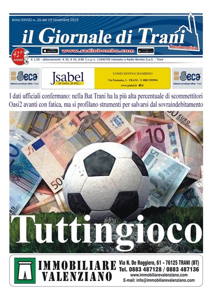 È in edicola il nuovo numero del Giornale di Trani, 20ma uscita del 2019. Titolo di copertina: «Tuttingioco». I dati ufficiali confermano che, nella Bat, Trani è la città con la più alta percentuale di scommettitori. Oasi2 porta avanti con fatica i suoi progetti, ma si profilano strumenti per salvarsi dal sovraindebitamento.