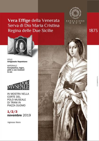 Tra le attività in programma presso il Polo Museale di Trani, in occasione della festività di Tutti i Santi e della commemorazione dei defunti, la Fondazione S.E.C.A. si pregia di esporre nella corte di Palazzo Lodispoto, per la prima volta, la “Vera effige della Venerata Serva di Dio, Maria Cristina Regina delle Due Sicilie – 1873”. L'effige sarà in mostra nei giorni 1/2/3 novembre ed è previsto l'ingresso libero.