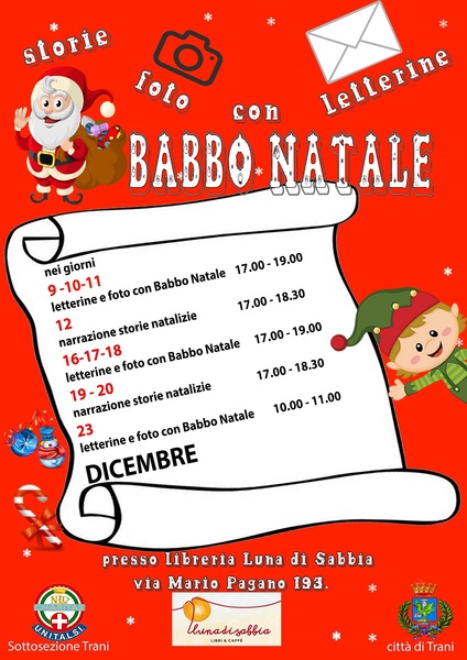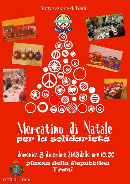 L'Unitalsi di Trani anche quest'anno propone delle attività per il periodo natalizio. Il mercatino di Natale della solidarietà si terrà domenica 8 dicembre in piazza della Repubblica, dove verrano offerti oggetti e decorazioni natalizie realizzate a mano dai volontari e dai ragazzi dell'associazione, presepi e trenini di cioccolato, sfere natalizie ripiene di cioccolatini, dolci artigianali, tanta allegria e sorrisi, e Babbo Natale che sarà a disposizione per foto e consegna letterine nei giorni 9 - 10 - 11 - 16 - 17 - 18 dicembre dalle 17 alle 19 e il 23 dalle 10 alle 11 presso la libreria Luna di sabbia, in via Mario Pagano 193.
