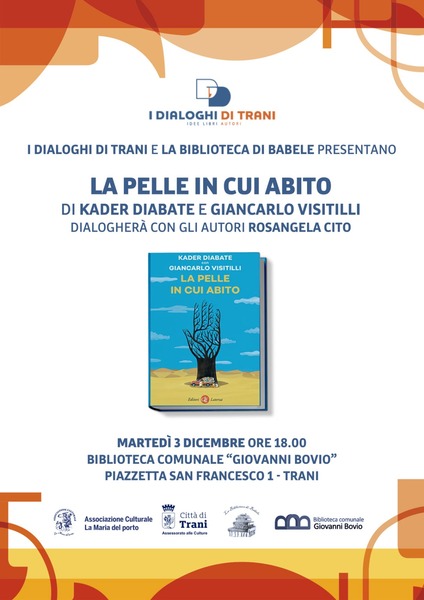 Martedì 3 dicembre, a Trani alla Biblioteca Comunale G. Bovio, i Dialoghi di Trani e la Biblioteca di Babele presentano il libro "La pelle in cui abito" (Editori Laterza) di Kader Diabate e Giancarlo Visitilli, docente e giornalista, collaboratore di Repubblica-Bari. Con gli autori dialogherà Rosangela Cito.