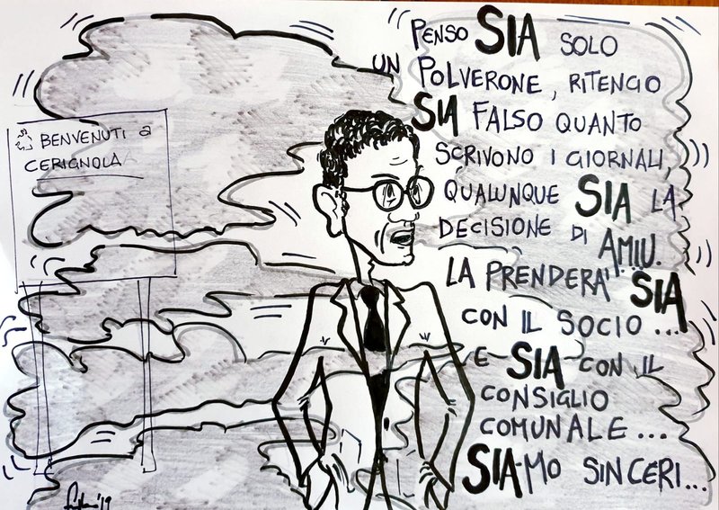 Un Amedeo Bottaro che, smentendo, ammette e, precisando, conferma. E che gioca astutamente con le parole così come il nostro vignettista, Giancarlo Falco, che raffigura in punta di matita, e di italiano, il caso Sia-Amiu.