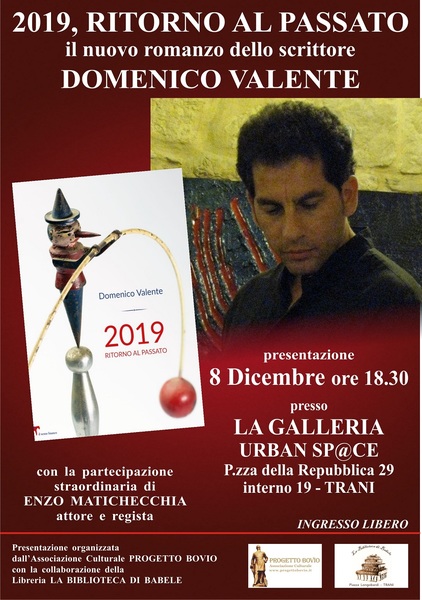 Domenica 8 dicembre, alle ore 18.30, presso “La Galleria, Urban Sp@ce”, in piazza della Repubblica 29, int. 19 sarà presentato il nuovo romanzo dello scrittore tranese Domenico Valente, "2019, Ritorno al Passato" (Il Seme Bianco editore).