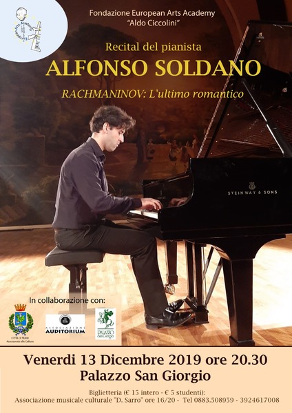 La fondazione European Arts Academy "Aldo Ciccolini" presenta il recital del pianista Alfonso Soldano "Rachmaninov: l'ultimo romantico". "L'appuntamento è per venerdì alle 20.30 a palazzo San Giorgio.