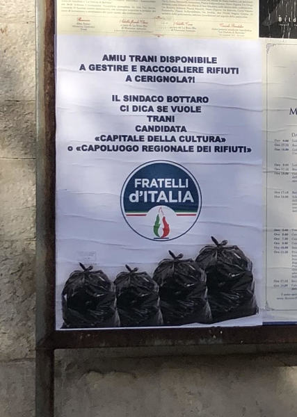 Intanto, in diverse zone della città è possibile vedere i manifesti (in foto) che FdI ha fatto affiggere: “Il sindaco Bottaro ci dica se vuole Trani candidata capitale della cultura o capoluogo regionale dei rifiuti”.
