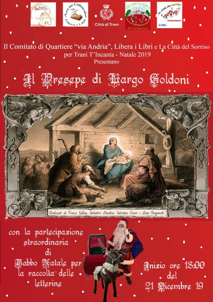 Il comitato di quartiere via Andria, Libera i libri e la città del sorriso presentano il presepe di Largo Goldoni. Dalle ore 18 di sabato 21 dicembre ci sara la benedizione del presepe con don Enzo ed è prevista anche la presenza del primo cittadino Amedeo Bottaro.