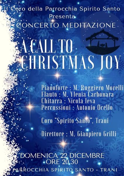 Il coro della parrocchia dello Spirito Santo presenta il concerto-meditazione "A call to Christmas joy". L'appuntamento è questa sera alle ore 20.30. Al pianoforte suonerà il maestro Ruggiero Morelli, al flauto la maestra Ylenia Carbonara, alla chitarra Nicola Ieva e alle percussioni Antonio Ocello. Il coro dello Spirito Santo sarà guidato dal direttore maestro Gianpiero Grilli.