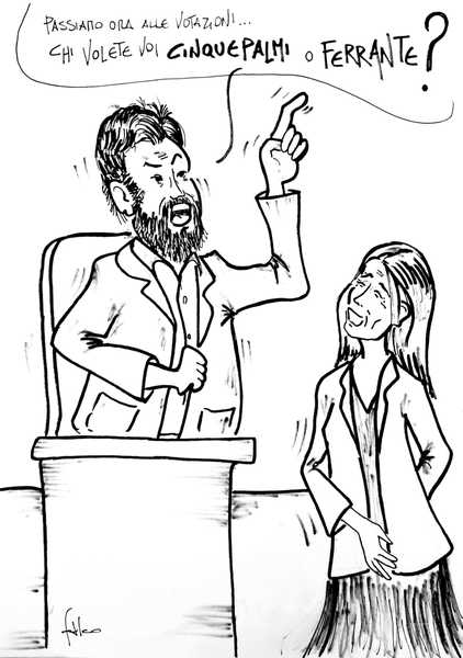 La disputa è continuata a distanza sui social nelle ore successive, e così Giancarlo Falco raffigura i «contendenti», alla ripresa del consiglio comunale di oggi, alle prese con una insolita votazione su se stessi.