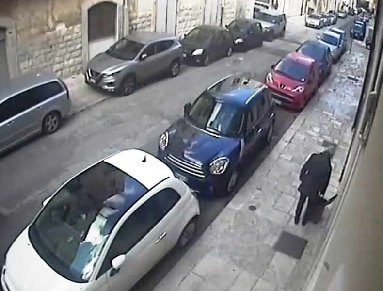 Una telecamera privata posta sulla strada documenta l'imbarazzante furto, ma le immagini non saranno utili ad individuare il responsabile, poiché volge le spalle all'obiettivo che lo riprende.