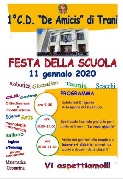 Sabato 11 gennaio 2020 presso il 1° Circolo Didattico “De Amicis” di Trani si terrà la Festa della Scuola Primaria: alunni e genitori