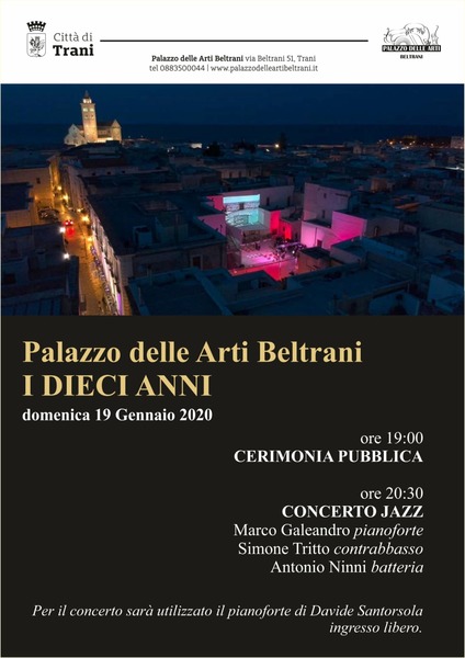 Domenica 19 gennaio la città di Trani celebra i 10 anni dalla riapertura di palazzo Beltrani con una manifestazione ad ingresso libero. La cerimonia pubblica sarà alle ore 19, mentre alle 20.30 il concerto jazz con Marco Galeandro al pianoforte, Simone Tritto al contrabbasso e Antonio Ninni alla batteria. Per il concerto sarà utilizzato il pianoforte di Davide Santorsola.