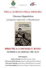 Domenica 26 gennaio 2020, alle ore 18.00, in occasione della Giornata della Memoria, l’assessorato alle Culture della Città di Trani, in collaborazione con l’Associazione ANTEAS di Trani, promuove un incontro tematico incentrato sulla figura di Vincenzo Pappalettera, partigiano di origine tranese che nel gennaio del 1945 fu deportato nel campo di concentramento nazista di Mauthausen in Austria. Si discuterà, tra l’altro, del libro Tu passerai per il camino (ed. Mursia, 1965) scritto dallo stesso Pappalettera, per il quale nell’anno 1966 è stato insignito del premio “Bancarella”.