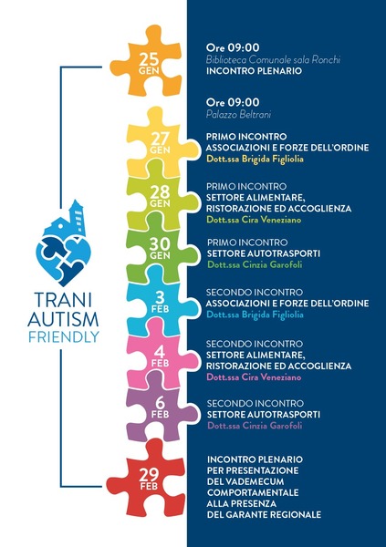 Così il presidente del consiglio comunale, Fabrizio Ferrante, anticipando la nuova iniziativa del progetto «Trani autism friendly», di cui è cuore pulsante e che vedrà in quella occasione, presso la Bovio, alcune professioniste della Asl Bt impegnate nei successivi incontri di formazione dei soggetti che hanno aderito al protocollo d'intesa, siglato recentemente a Palazzo Beltrani: si tratta di Brigida Figliolia, Vincenza Garofali e Cira Veneziano. Già definite le date per la formazione specifica per i soggetti aderenti