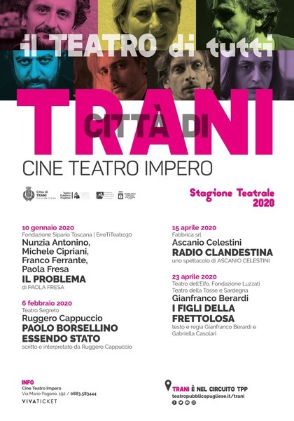 Giovedì 6 febbraio alle 21 al cinema Impero di Trani, nell'ambito della stagione teatrale 2020, il Teatro Segreto con la scrittura e la presenza in scena di Ruggero Cappuccio presenta "Paolo Borsellino, essendo Stato", disegno luci e aiuto regia di Nadia Baldi.