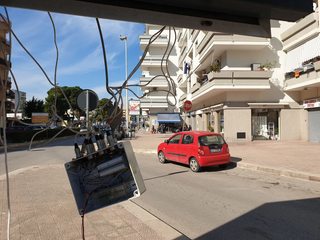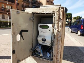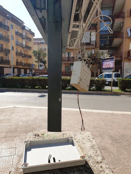 L’altra notte, poi, apparentemente a causa del forte vento, si è aperto lo sportello sottostante un vecchio roter pubblicitario, facendo penzolare nel vuoto una scatola di raccordo, cavi di segnale ed anche elettrici. Contemporaneamente lo sportello della colonnina di alimentazione dell'impianto risulta aperto con il contatore a portata di mano, anche di bambini.