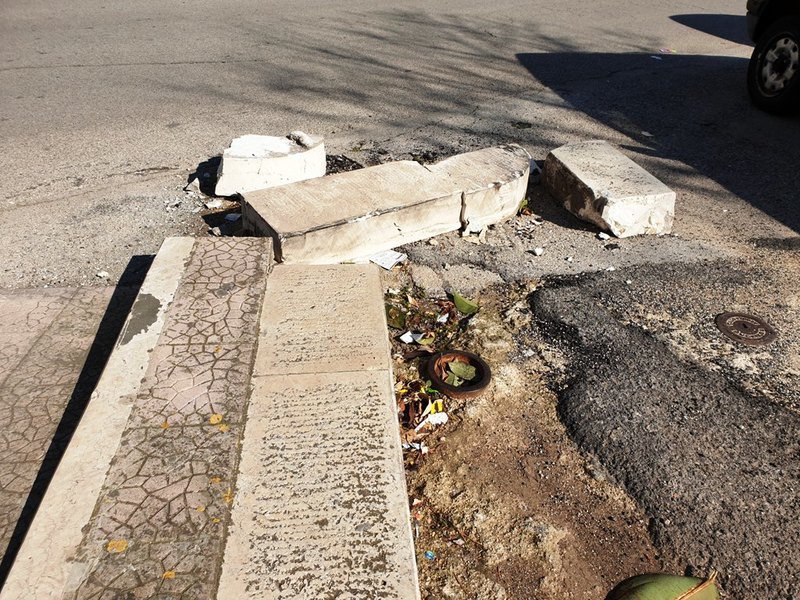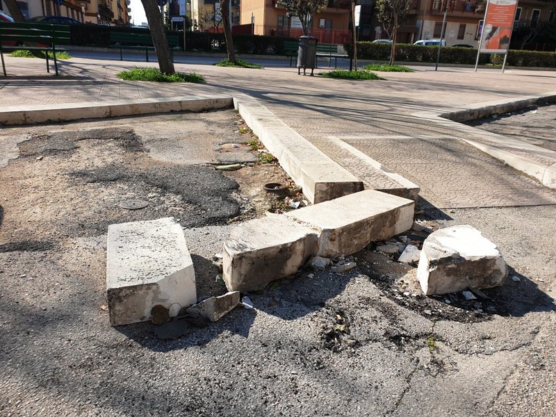 Spuntano pericoli in serie in piazza Alfredo Albanese, alle porte del quartiere Pozzopiano. Dapprima si è rotto il cordolo di un raccordo pedonale, determinando potenziali pericoli per auto e pedoni e ostruendo un posto auto per diversamente abili, nonché occupando parzialmente lo stesso scivolo per soggetti con disagio.