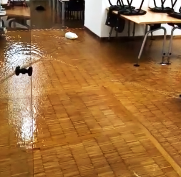 E, così, in occasione di copiosi temporali, le pendenze determinano la formazione di strati d'acqua che allagano la sala lettura.