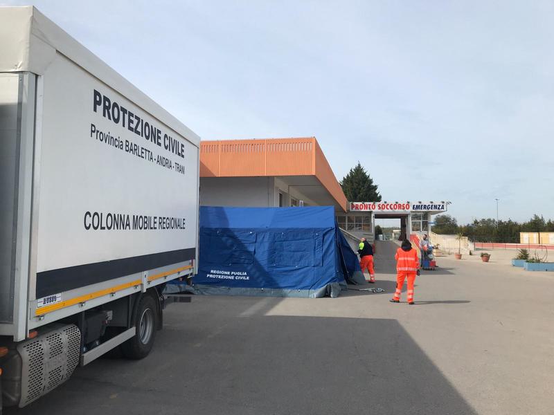 Allestite oggi presso i Pronti Soccorso degli ospedali di Andria, Barletta e Bisceglie delle tende per consentire il pre-triage di pazienti eventualmente affetti da Coronavirus. Le operazioni di montaggio delle tende sono state eseguite dalla Protezione Civile. "Ringraziamo per la collaborazione - dice Alessandro Delle Donne - si tratta di un attività di prevenzione che non deve allarmare la popolazione. Non ci sono casi né sospetti né accertati nella nostra provincia, ma è giusto che ci organizziamo per gestire al meglio e nella maniera più corretta possibile eventuali situazioni di allerta".