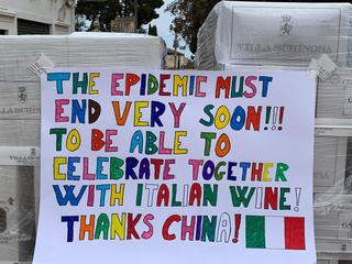 Inoltre, i bambini del cantiniere hanno realizzato un cartellone di ringraziamento per l’aiuto ricevuto dai cinesi che è stato apposto sull’ultima pedana. L’augurio, in lingua inglese, è che questa pandemia finisca presto per poter festeggiare insieme con il vino, rigorosamente made in Italy.