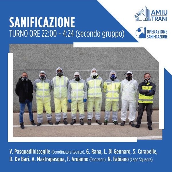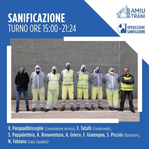 «Dall’8 marzo 2020, data della prima ordinanza a firma del Sindaco di Trani Amedeo Bottaro relativa ad attività di sanificazione e avente ad oggetto la disposizione di servizio per COVID-19, AMIU sta mettendo in campo uno sforzo straordinario. Le attività di sanificazione sono distribuite su 3 turni lavorativi con un rilevante impiego di mezzi e personale.