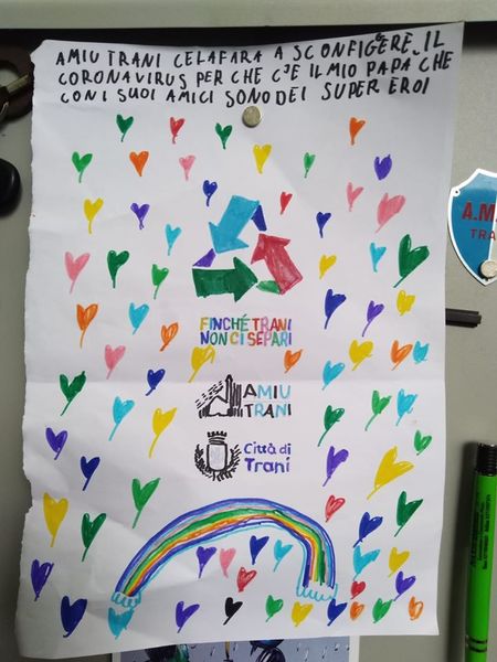 «Ci sono giornate che iniziano con un messaggio capace, anche e soprattutto in un momento come questo, di darti grandi emozioni. Oggi è una di queste giornate. Appena sveglio mi è arrivato il messaggio di un “eroe” dell'AMIU di Trani con un disegno fatto da sua figlia di 7 anni. Antonietta Fabiano ha interpretato ed elaborato la situazione di emergenza rivolgendo il pensiero a suo padre Nino (dipendente AMIU) e a tutti i suoi colleghi».