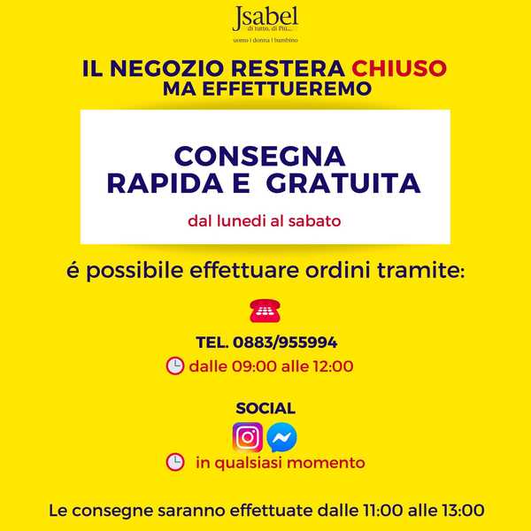 Jsabel resta chiuso, ma consegna regolarmente a domicilio in maniera veloce e soprattutto gratuita. L'ormai ben noto punto vendita di articoli di biancheria e molto altro per uomo, donna e bambino, a Trani in via Postumia 2, consente alla clientela di effettuare ordini telefonici.