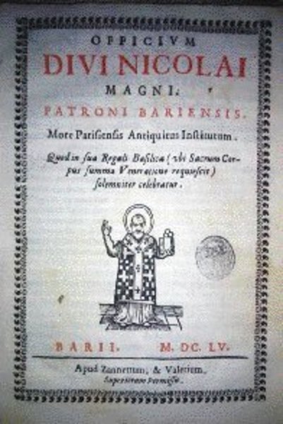 Il titolo dell'opera è «Officium divi Nicolai Magni patroni bariensis more parisiensis antiquitus instititum, Bari, apud Zannettum & Valerium, HB 1655».