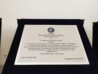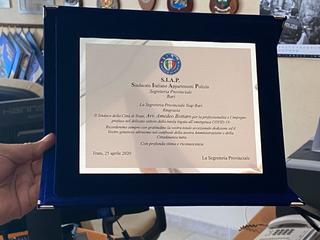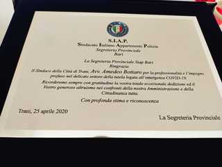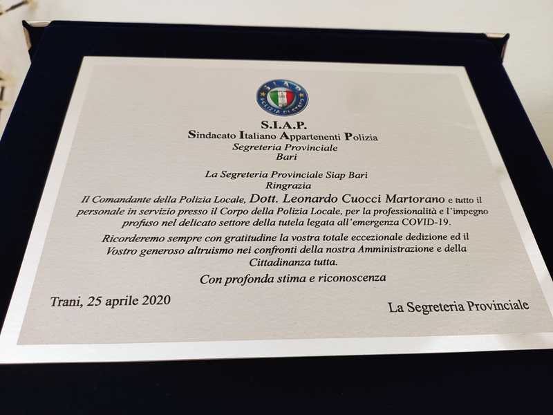 Nel giorno della Liberazione, il sindaco di Trani, Amedeo Bottaro, il comandante della Polizia Locale di Trani, Leonardo Cuocci Martorano, e il Dirigente del Commissariato di P.S. di Trani, Dott. Francesco Triggiani, hanno ricevuto una targa di ringraziamento fatta realizzare dalla Segreteria Provinciale di Bari del Sindacato Italiano Appartenenti Polizia (S.I.A.P.) per sottolineare l'impegno profuso in queste settimane di emergenza covid-19.