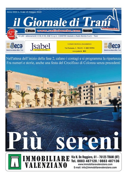 È in edicola il nuovo numero del Giornale di Trani, nona uscita del 2020. Titolo di copertina: «Più sereni». Nell'attesa dell'inizio della fase 2, sembrano calare i contagi e si programma la ripartenza. Tra numeri e storie, anche una festa del Crocifisso di Colonna senza precedenti.
