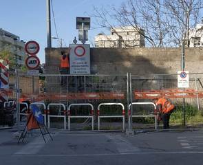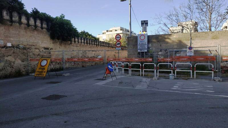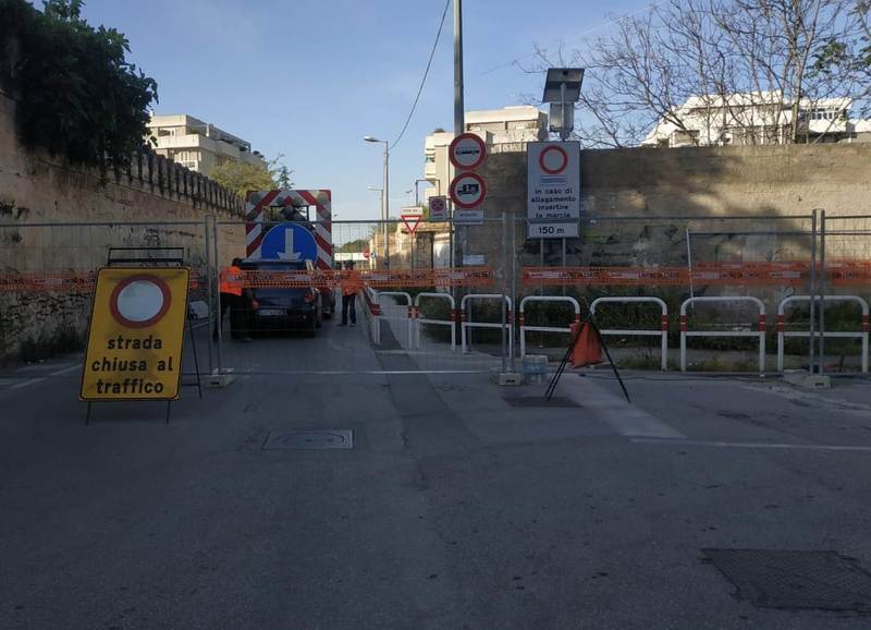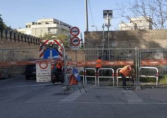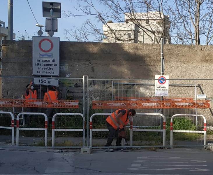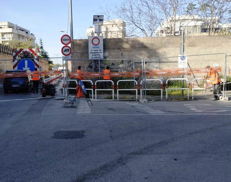 Dunque, l'allargamento della strettoia prende forma con la chiusura della stessa e l'eliminazione di tutto quello che oggi, ai fini dell'ampliamento della sede stradale, non serve più: rimosso momentaneamente, quindi, anche il cartello di preavviso in caso di allagamenti del sottovia, dotato di luci lampeggianti di richiamo.