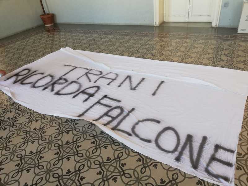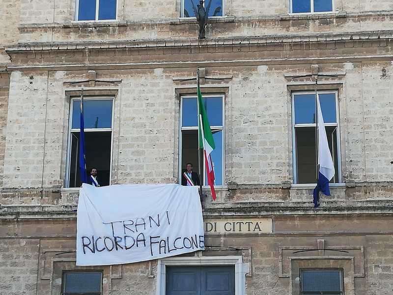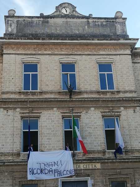 Uno striscione bianco, con su scritto «Trani ricorda Falcone», pende da sabato pomeriggio dalle finestre al primo piano di Palazzo di città.