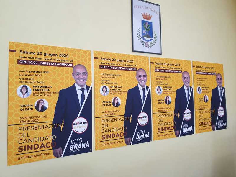 Vito Branà, come detto, si candida a essere eletto primo cittadino, rappresentando i valori e le idee dei 5 stelle: «Sono orgoglioso di rappresentare il movimento in questa tornata elettorale perché portiamo avanti i valori iniziali del gruppo. Dal nostro punto di vista il discorso dei 5 stelle a livello nazionale è relativo perché noi siamo focalizzati sulle problematiche della città di Trani. Proponiamo un modo nuovo di governare, ma se dovessimo andare all’opposizione avremo un atteggiamento di apertura nei confronti delle altre forze politiche: per le battaglie importanti non guardiamo al colore politico, ma valutiamo solo il tema e l’argomento».