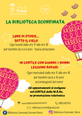 Iniziando dai più piccoli, si è deciso di riconfermare gli appuntamenti di promozione della lettura spostandoli nel cortile antistante la sala Bi.R.Ba. (sezione ragazzi) con ingresso da Via Casale. Tornano, infatti, gli incontri con Lune…dì storie sotto il cielo ogni lunedì dalle ore 17 alle ore 18 per bambini da 3 a 6 anni (fascia prescolare) e con In cortile con Gianni: i nonni leggono Rodari ogni mercoledì dalle ore 17 alle ore 18 per bambini da 6 a 10 anni, accompagnati dai nonni. Gli appuntamenti partono da lunedì 29 giugno e sono su prenotazione telefonica al seguente numero 0883.482149.