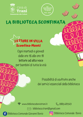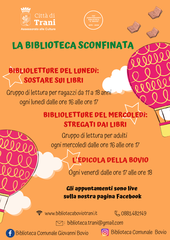 La biblioteca comunale G. Bovio ha scelto di andare incontro agli utenti, residenti nel comune di Trani, più anziani e/o a chi è impossibilitato a recarsi di persona, attivando La biblioteca a casa tua, il servizio di prestito a domicilio su prenotazione. Ogni giovedì pomeriggio una bibliotecaria consegnerà presso le abitazioni i libri scelti.