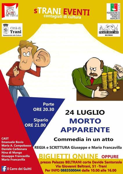 Ritornano, finalmente, dopo il lockdown, gli spettacoli teatrali. Venerdì 24 luglio, con apertura del sipario alle ore 21, il Carro dei Guitti presenta “Morto apparente”, commedia in un atto di Giuseppe Francavilla portato in scena dal 2002 al 2006 nei teatri e nelle scuole pugliesi con oltre 200 repliche.