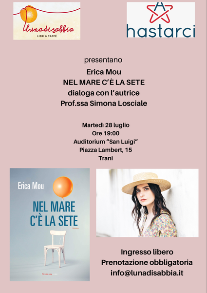 Luna di sabbia in collaborazione con Hastarci Trani presenta ERICA MOU "Nel mare c'è la sete" edito Fandango libri dialoga con l'autrice prof.ssa Simona Losciale. Appuntamento per martedì 28 luglio ore 19:00 presso Auditorium "San Luigi" piazza Lambert, 15