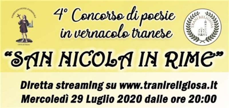 Questa sera alle ore 20 sarà trasmessa in diretta streaming sul canale youtube Trani Religiosa la serata di premiazione del 4° concorso di poesie in vernacolo "San Nicola in Rime".