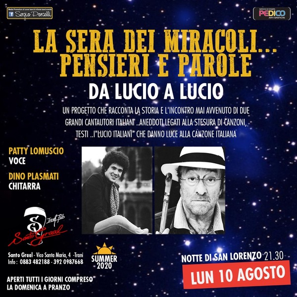 La notte di san Lorenzo, lunedì 10 agosto, al Santo Graal di Trani si terrà "La sera dei miracoli...pensieri e parole - Da Lucio a Lucio", un progetto che racconta la storia e l'incontro mai avvenuto di due grandi cantautori italiani, aneddoti legati alla stesura di canzoni, testi, i "Lucio italiani" che danno luce alla canzone italiana. Patty Lomuscio voce, Dino Plasmati chitarra.