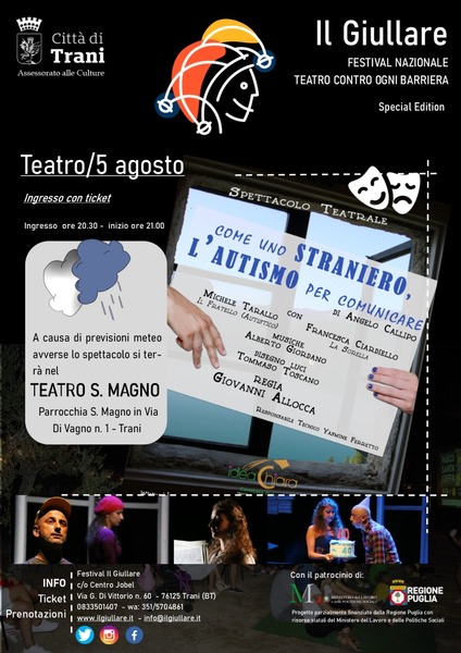 In merito alla rassegna "Festival Il Giullare" oggi, mercoledì 5 agosto, sarà presentato nella sala teatro San Magno "Come uno straniero: l’autismo per comunicare" (ingresso ore 20.30 – sipario ore 21.00).
