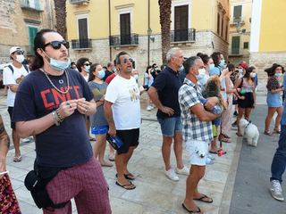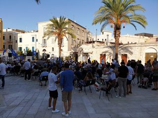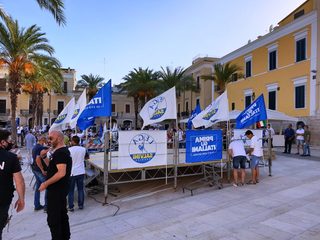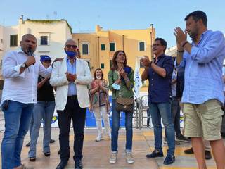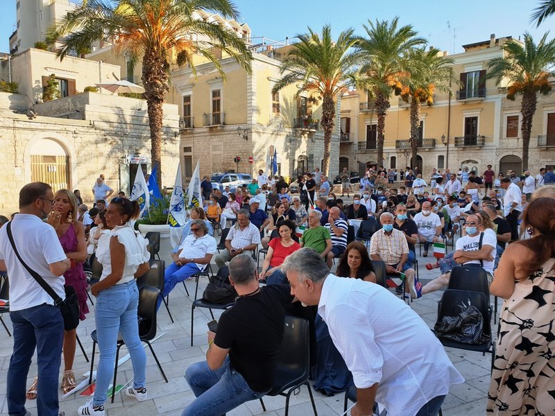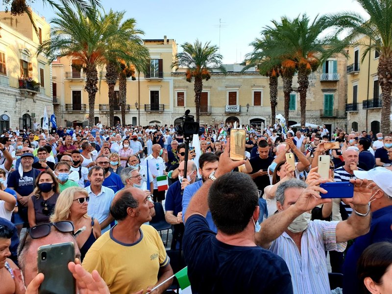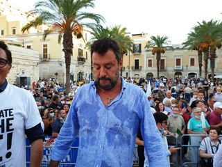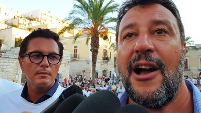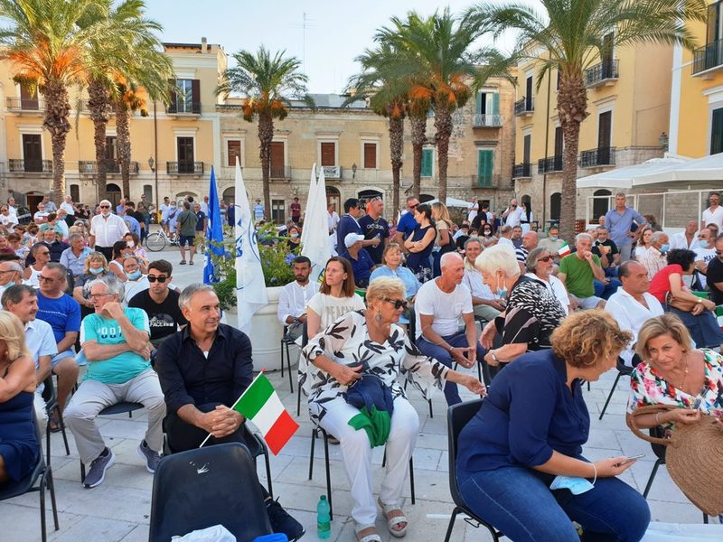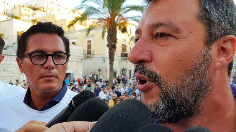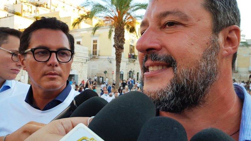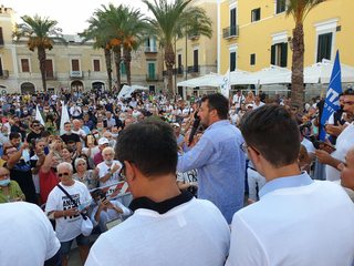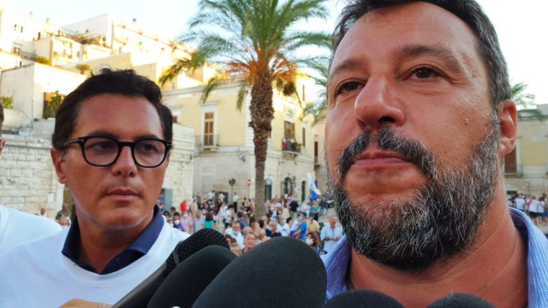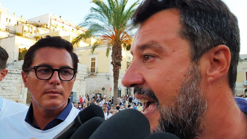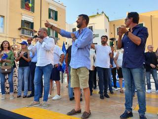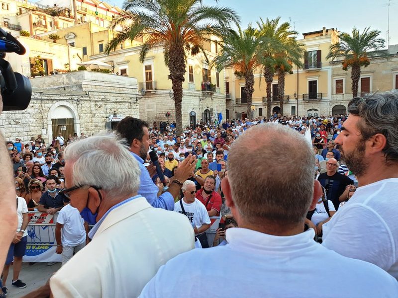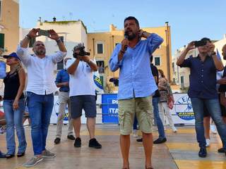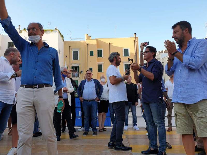 In Puglia, e a Trani, Lega, Forza Italia e Fratelli d'Italia sono alleati «per mandare a casa dopo quindici anni il centro-sinistra», ha esordito Salvini sul palco di piazza Teatro dopo l'ennesima camicia cambiata al ritorno dal mare.