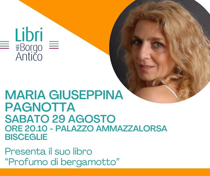 Questo sabato, 29 agosto, alle 20.10 presso Palazzo Ammazzalorsa, a Bisceglie, nell'ambito della rassegna Libri nel borgo antico, la scrittrice e sceneggiatrice tranese Maria Giuseppina Pagnotta presenta il romanzo «Profumo di bergamotto», edito da Magister, ambientato al Sud ed ispirato a una storia vera che viaggia fra le due grandi guerre fino ai nostri giorni.
