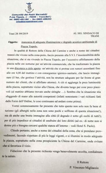 Nell'ultima lettera, inviata lo scorso 18 giugno sempre al sindaco, ma anche all'Amiu, padre Migliaccio aveva posto in risalto «l'occupazione quasi totale della piazza con tavolini, sedie e derrate alimentari. Piazza Tiepolo - sottolineava - viene popolata da un numero esagerato di avventori, tale da creare non pochi disagi a tutto il vicinato sia per l'abbandono di immondizie, vetri e bottiglie dappertutto, sia per le zone adiacenti la chiesa del Carmine, imbrattate di urina a causa della totale mancanza di servizi igienici nella zona. Siamo fermamente convinti del fatto - proseguiva il rettore della chiesa - che non si può dare da parte del Comune il permesso per attività che prevedono masse di persone, che vengono anche da fuori Trani, e non offrire loro servizi adeguati che tengano il fenomeno sotto controllo. Noi ogni settimana (la mattina del sabato, della domenica e del lunedì) ci troviamo così in mezzo alla sporcizia con la gente che, venendo in chiesa per la messa delle 9, si trova dinanzi a uno spettacolo indecoroso».